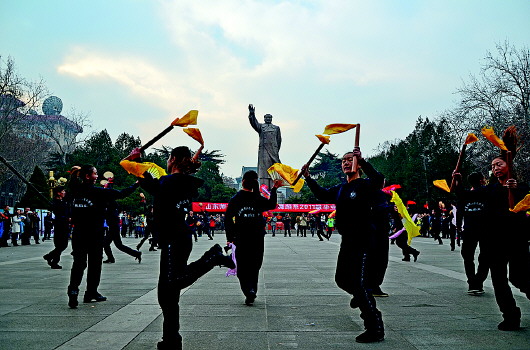 9日,在山东师范大学毛主席像前的广场上,56名学生举行了音乐学院舞蹈系2011级毕业汇报,在冬季低温天气里,他们跳舞的热情,燃烧了整个广场。 王晓 摄