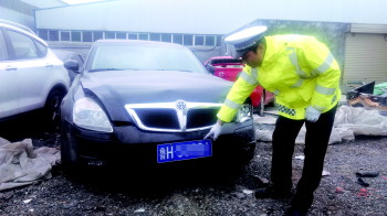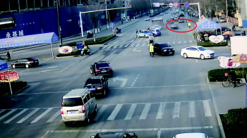 8日下午4点,市中交警大队特勤中队民警张飘飘在济安桥路与太白楼西路交叉口处执勤,发现在路口等红灯的一辆黑色轿车很可疑,便径自走过去进行例行检查。“挡风玻璃上没有任何年检标志,而且车牌看上去也有问题。”张飘飘说,他刚绕过车头走向车子左侧,黑色轿车突然加大油门右转,试图由南向北向济安桥路逃脱,不料在右转的过程中,该车先刮倒了一辆电动三轮车,然后冲上了路边的绿化带。
