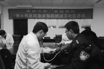 近日,德州市人民医院开展“健康山东,幸福德州”为主题的送医下社区活动,为德州市交通警察支队四中队民警进行义务查体及急救健康知识培训。 本报通讯员 傅启凯 摄