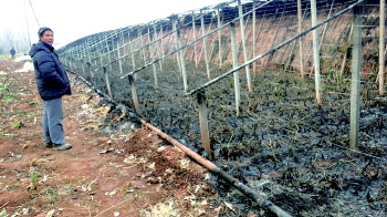 杨女士的丈夫站在被烧焦的大棚前,一筹莫展。