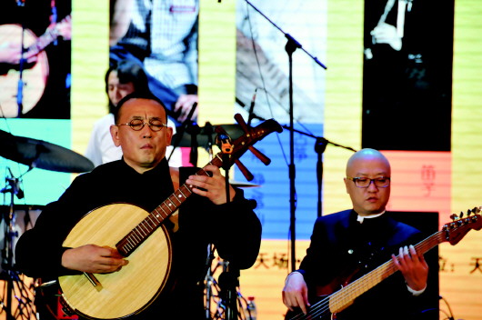 9日晚上,金佛民族爵士乐团专场演奏会在滨州职业学院拉开帷幕,演出中既有钢琴、萨克斯、贝司、爵士鼓等西洋乐器,又有中阮、三弦、古筝、笛子传统演奏乐器,为现场观众带来了一场中国传统音乐风格与爵士乐完美融合的精彩演出。图为中阮大师冯满天正在演奏。