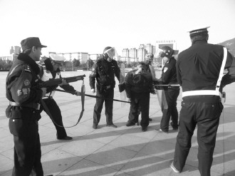 日前薛城多警联勤大队在仙坛苑广场进行了应急处突模拟演习,模拟两名人员正在持刀威胁群众的情况,民警用携带的防暴枪、警用伸缩钢叉及抓捕器,对危险人员进行了有效控制。 本报通讯员 褚胥 本报记者 袁鹏 摄影报道