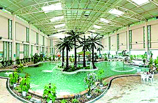 我们首先进入的是那个大的温泉池。池内水色碧蓝透明,池上水汽蒸腾氤氲,池中还有一绿色“小岛”,椰风海韵,绿树环绕,恍如来到潮湿温润的热带雨林之中。移步34度的池中,滑爽的泉水亲近着肌肤,适度的水温舒展着身心,蒸腾的水雾浸润着脑际,愉悦之情直达心门,顿觉心旷神怡,如梦似幻,欲醉欲仙,妙不可言。简单热身之后,打开“高射水枪”开关,高压作用下的水注从高处持续冲击脊背,均匀拍打,全身酥痒,周体通泰。每当有客人在池边小憩,那标致的服务生会款款来到你身边,送来温热的矿泉水。泉池的西侧有鱼吻池,北侧是汗蒸房,南侧是游泳池,我们分别进行了一一体验。