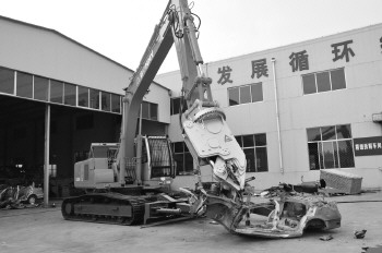 10日下午2点多钟,鸢飞机动车回收公司的副总经理刘乐樵,正准备着向媒体记者介绍该公司正在使用的一种机动车快速拆解机。他说,一辆已经做好报废手续的轿车,整车送到该机器前,大约五分钟时间,轿车就能变成一块块碎片,交给工作人员分类处理,“中巴客车也只需要25分钟左右”。