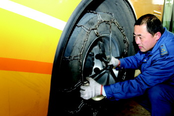 “电动公交车之前之所以不能挂防滑链条,主要是因为气囊与轮胎间距较小。一旦链条松动,会打坏气囊和车辆高度调节阀。”青岛崂山巴士公司汽车三队技术队长孙仁国说,普通防滑链条两端使用胶皮扣连接,车辆运转时,与轮胎之间会有松动间隙,对普通公交车没有影响,但很容易破坏气囊及车辆高度调节阀。如果出现损坏,不仅会造成车辆停驶,而且维修成本很大。面对电动公交无法挂防滑链条的问题,公交集团曾专门出台预案,一旦出现路滑情况,电动公交只能停运,通过启动其他公交车增援的方式补足运力。
