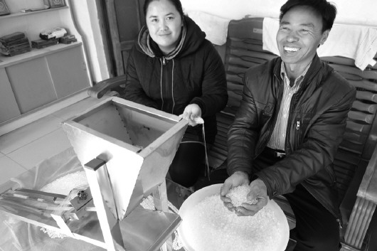 近日,惠民县姜楼镇梨行宋村村民宋宗亲的家中,传来机器的忙碌声。模具粘上半成品的水晶珠后,放在另一台机器上打磨,仅用了40秒,原本粗糙没有光泽的水晶珠就现出了晶莹剔透的模样。宋宗亲夫妇再把水晶珠串成各具特色的手链或项链供给浙江义乌小商品城,一年能净赚10万元。