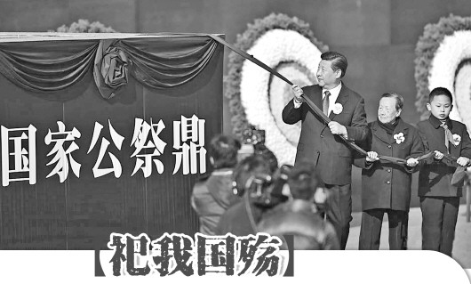 首个南京大屠杀死难者国家公祭仪式上,中共中央总书记、国家主席、中央军委主席习近平为国家公祭鼎揭幕。站在总书记身旁的,是85岁的南京大屠杀幸存者代表夏淑琴和13岁的南京大屠杀死难者遗属阮泽宇。