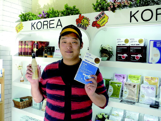 崔景德觉得摆剪刀手太单调,随手拿起从韩国运来的化妆品展示。