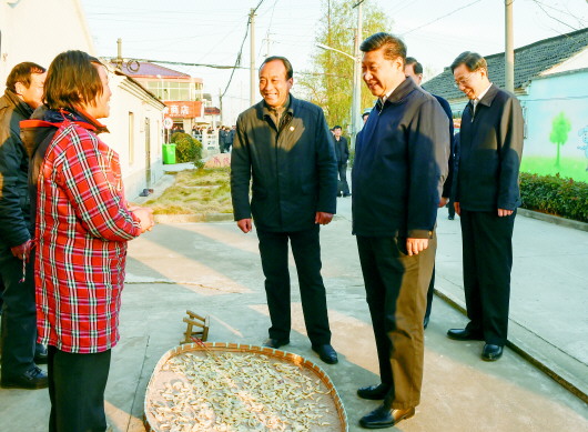 习近平考察了当地的新农村建设情况,来到世业镇永茂圩自然村。习近平走进村民洪家勇家,走进厨房,掀开锅盖,里面炖着土豆烧肉,他说“真香!”接着,又打开冰箱看了看冷藏着的菱角等食物,高兴地说,希望大家日子都过得殷实。看到院里种着萝卜、白菜、菠菜,总书记幽默地说,秋天的菠菜就是“秋波”吧。