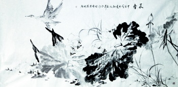 除了山水、人物题材创作,张宏伟和赵初凡两位艺术家还当场合作了作品《荷香》,张宏伟的水墨荷花,以泼墨写出荷叶,双钩写荷花,写中带工,不施色彩,却更显清新明快。赵初凡在左上角作展翅的鹭鸶,打破了寂静的画面,生气活现。古人常以“中通外直”来赞美荷花,而这也是伟人在特殊岁月中所呈现出的可贵品质。