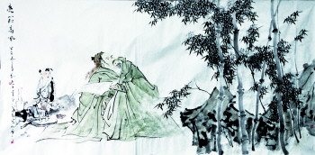 同样表现人物的《亮节高风》是由韦辛夷和刘书军完成的。韦辛夷用单纯的线条勾勒塑形。在作画中,韦辛夷强调:“人物画是线的艺术,一根线要练一辈子,每根线要放在它该放的位置上,作品才能打动人。”而竹石,书童为刘书军完成,他用竹石来映衬主题,竹叶高低错落于竹竿之间,清劲秀美,超尘脱俗。