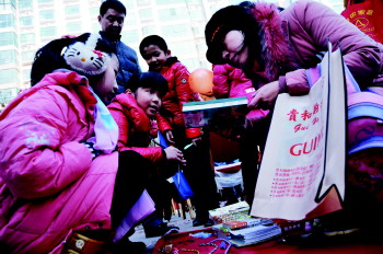 参加换物的小朋友正在推销自己的书。本报记者 李岩松 摄