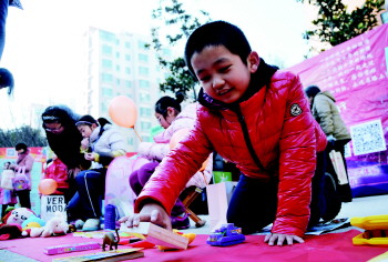 一位小朋友布置自己的摊位。本报记者 李岩松 摄