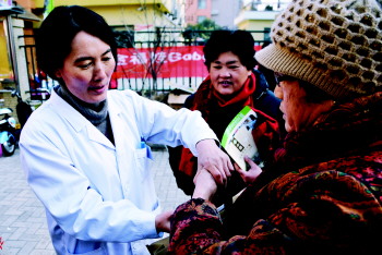 专家指导按摩技巧。本报记者 李岩松 摄