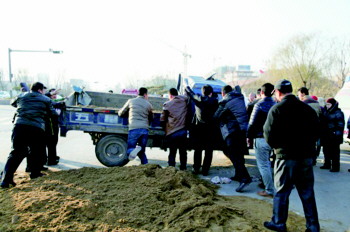 现场十多位市民帮忙把侧翻的三轮车抬了起来。 本报记者 郭庆文 摄