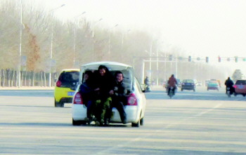 12月12日,在武城县城郊,一辆教练车用这样“玩命”的方式载人在路上行驶。