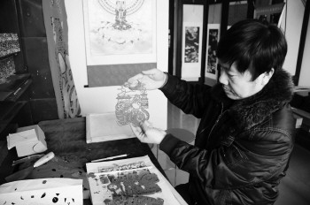 在第四届山东文博会德州展区内,张建志8米长的《百子图》剪纸作品曾让观展者叹为观止。12月14日,刚刚被入选为第四批市级非物质文化遗产代表性项目名录的剪纸负责人张建志,仍在工作室内创作。一幅幅栩栩如生、设计精致的剪纸作品悬挂其间,题材囊括了花鸟人物、脸谱、动物、吉祥娃娃等。木质的桌台前,刻刀像游龙一样在张建志手中灵巧地舞动着,随着刻刀的起落,不一会儿功夫,从他指尖飞落出一幅独具韵味的剪纸作品《生肖虎》。现在,张建志致力将工艺剪纸从家庭小作坊式的传统制作方式变身为文化创意产业,其剪纸作品早已远销全国各地以及法国、德国等。