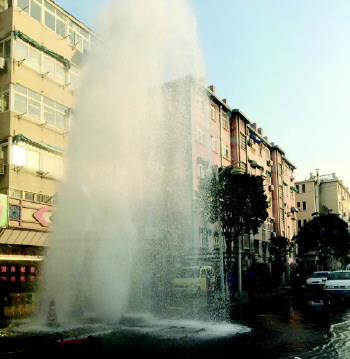 “有辆车把这个消防栓撞倒了,大水直接就喷了出来,特别壮观。”目击者张先生告诉记者,可能是水压比较大,向外喷出的自来水形成近七八米高的水柱,最高时达10米。而后,张先生向记者展示了当时他用手机拍下的画面,从照片上来看,喷涌而出的水柱一度达到四层楼高。