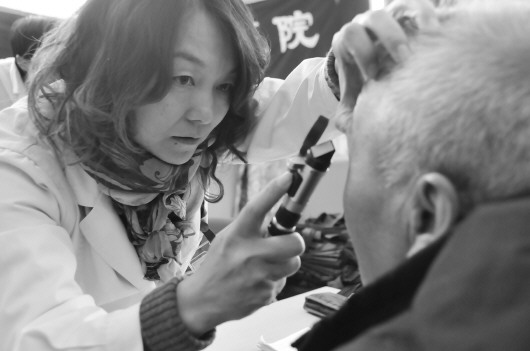 济南市第二人民医院的医生现场为市民检查眼睛。 本报记者 李运恒 摄