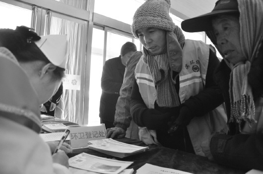 因当天问诊人数较多,为保证义诊当天每位前来问诊的环卫工人都能得到专家的解答,不仅将环卫工人分批次、分时间段安排,还在挂号处为环卫工人设置了“绿色通道”——环卫登记处,保证环卫工人能优先咨询专家。
