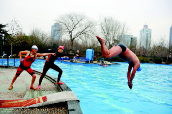 走你,在两名同伴的配合下,一名冬泳爱好者潇洒的跳入水中,三人幽默快乐的冬泳方式,引来了不少笑声。近日,淄博持续低温,室外温度接近-10℃,但是严寒没能阻挡冬泳爱好者游泳的热情,热身、起跳、入水、畅游,他们每天坚持,乐在其中,他们说天气寒冷会让人感到更加刺激,也更能享受到冬泳的乐趣。