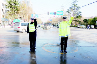 面对车流,本报记者袁鹏(右)感到压力很大。 本报通讯员 王帅 摄