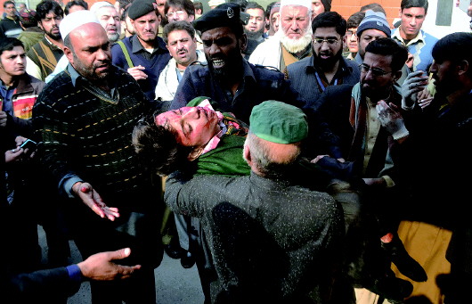 12月16日,在巴基斯坦白沙瓦,人们运送一名受伤学生。 新华/美联