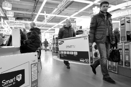 12月15日,俄罗斯一家电器商场,顾客正抢购平板电视机。卢布的持续贬值引发消费者对物价上涨的担心,并引发了家电抢购潮。 新华/法新