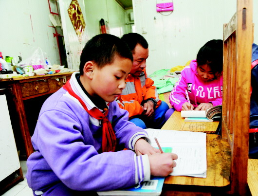 15日下午,在济南段北环卫所保洁员公寓,保洁员周新成难得有时间陪孩子写作业。 本报记者 周青先 摄