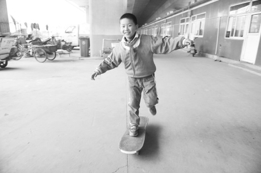 平日放学后,周涛的娱乐方式就是在桥下的保洁员公寓旁玩滑板。