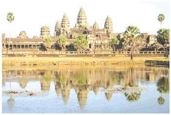 我们按捺不住探寻神秘吴哥窟的心情,听导游做完大致介绍后即向主建筑寺庙山进发。穿过两个回廊后,我们进入第三回廊。我们先是进入一个开阔的庭院,周围是熙熙攘攘的人群,抬头望时,看到几个高耸的塔庙。这是吴哥窟的第三层台基,即最内侧最高层台基,称为“巴甘”,正方形,整体像埃及的金字塔,但有两段叠成,巍然拔地而起十几米,比我们刚进门的一、二层回廊台基高出一倍。一个身着蓝白裙裾的美女,双臂展开出现在塔庙下方的门楣中,夕阳西下,整个塔庙呈现暖暖的金黄色,脑海里立刻涌现金璧辉煌的字眼,我赶紧掏出相机,让这美妙的瞬间成为永恒。我们开始向美女站立的塔庙进发。据研究,塔庙发展的极致便是印度教神庙所特有的寺庙山,整座寺庙由外往内层层升高。事实上,整个吴哥窟便是建立在许多山峰连绵而成的山脉之上,其中以顶层的中央塔庙最为重要。吴哥窟的寺庙山结构除了均衡对称之外,上层按照下层的固定比例缩减,中心也往西侧稍微偏移,视觉上显得高大而稳定。每层建筑都以连续长廊和门楼、角楼形成近似方形的结构。最高的平台山建了五座塔庙,塔顶尖耸,形如待开的莲花苞,排列成梅花状,是须弥山上的五座高峰。其中又以高42米的中央塔庙为最高,离平地约65米,是平原上显著的地标,不禁是整个寺庙的中心,也是绝对的圣地。前往顶层,4个方位各有3组阶梯可供登顶。虽然高度只有13米,但陡峭的高度却达70度,艰辛地攀爬代表着进入圣地势必经过辛苦的历程。人们攀着绳索小心翼翼地登顶。登顶之后,眼前空间开朗了很多,保存相对完好的石制建筑,整齐有序地排列在我们面前。