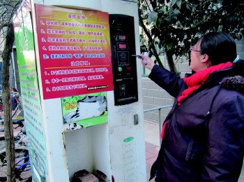 16日上午9时许,记者来到位于北宫街与文化路附近的北国之春小区,小区东门附近的一个净水设备底端已经有很大的磨损,接水的位置放着两块石砖,将水卡放置到刷卡处,还能显示出金额,但按下出水按钮,没有纯净水流出。