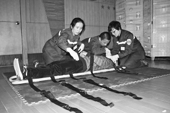 “伤员”卧位颈椎损伤的固定与搬运考试。 本报记者 郭庆文 摄
