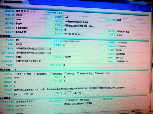 “昨天本来想去把违章处理了,之前因为其他原因已经扣了4分了,后来我借朋友的车出去玩,超速了,被记了6分,我就想反正分数还够用,结果我去交警队处理的时候被告知,我的驾驶证显示今年6月份在济阳我被扣了6分,并有50元的罚款记录。”孟女士气愤地说。“我都不认识驾驶证上的那个车牌号,也不认识那个扣我分的人。”孟女士表示,自己在2014年5月份并没有去过济阳,自己的驾驶证和身份证也没有借给过别人。“当时我的第一反应就是问我老公有没有用过我的驾驶证,他也说没有,我平时也没有印过相关的复印件。”