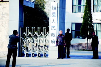 12月18日,市民在陵县人民政府前拍照留念。 本报记者 马志勇 摄