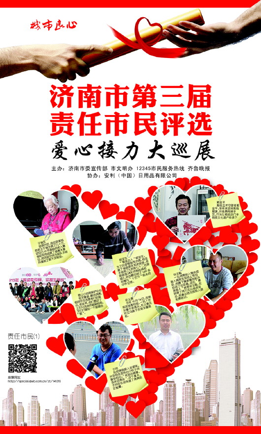 本报12月19日讯(记者 孟燕 王倩 蒋龙龙 林媛媛) 19日起,济南市第三届责任市民暨最佳公共服务奖评选正式启动。网络投票首日,省城近万名市民投票点赞。市民可继续登录齐鲁晚报网为您心目中的市民榜样投票。同时,21日上午,本报将启动全城爱心大接力,首站将从泉城广场开跑。