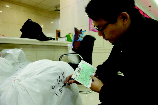 本报记者在包裹上填写邮寄地址。 本报记者 肖龙凤 摄