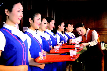 整个培训采取集中培训、系统授课、跟班轮训、模拟演练等多种教学方式进行培训。聘请专业导师在仪容仪表、语言表达、礼仪服务等方面进行强化训练,并进行了茶艺演示、托盘稳定、微笑待客、蹲式服务、推车售货等科目场景模拟演练。
