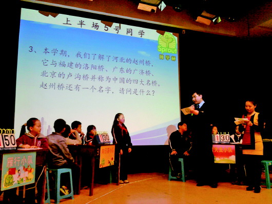 经过班级家委会和班主任老师一个多月的策划筹备,20日下午,山师附小2012级6班首届“博学杯”知识竞赛在本校学术会堂举行。全班同学按五个雏鹰小队进行团队合作比赛,比赛题目涉及语文、数学、英语、音乐、科学、体育、美术、论坛等多个方面,从400多题的题库中随机抽出必答题、抢答题和风险题进行竞赛。 新苗 摄影报道