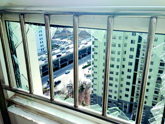 卧室与阳台的玻璃已经全部掉落,只剩一些尖锐的玻璃碎片依然在窗框上。阳台上的花盆碎了,阳台门散落成了好几块,倒在暖气片旁边。厨房的玻璃也被炸掉了一小半,地板上还有水渍,混合着爆炸后留下的烧焦痕迹,触目惊心。