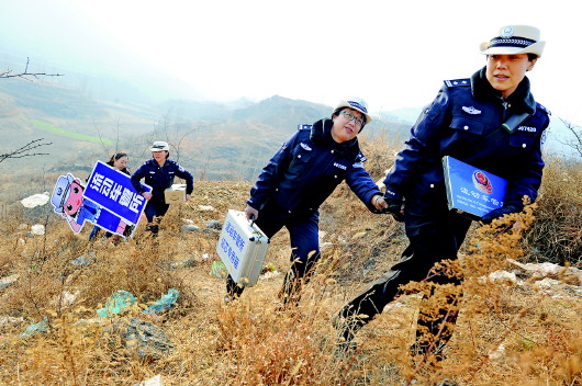 ◥济南市车管所民警和工作人员经常翻山越岭,把“流动车管所”搬到离车主最近的地方。