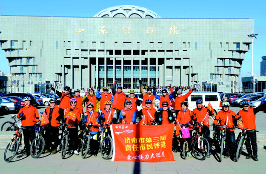当天,济南市委宣传部常务副部长凌安中为本报爱心骑行队授旗。本报爱心骑行队从泉城广场出发,一路经火车站、大明湖、济南世茂国际广场、齐鲁晚报名士豪庭社区文化服务中心,到达山东省博物馆,引来了大量市民点赞,将正能量洒满泉城。