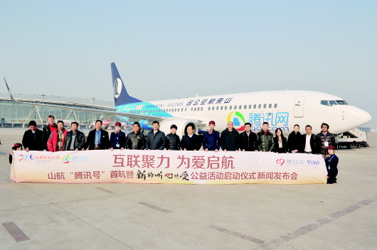 12月19日,山航、腾讯在济南签署战略合作协议,宣布双方在公益慈善、服务创新、行业发展等多个层面开展深入合作。在当天举行的山航“腾讯号”彩绘飞机启航仪式上,双方共同启动了“新聆听 心感受”公益活动,呼吁社会大众关注失明少年,捐献自己的声音,为盲童募集善款。 (记者 白新鑫 摄)