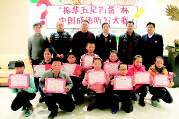 12月21日上午,本报为期近一个月的“振华五星百货杯”聊城第一届中国成语听写大赛完美落幕。大赛冠军最终由来自水城中学的马燕茹同学摘取,亚军、季军分别由来自文轩中学的张一博、周博文获得,进入前三甲争夺战的其他选手分别获得大赛优秀奖。比赛结束后随即举行了隆重的颁奖仪式。图为主办方、评委等人与前十名选手合影留念。 本报记者 李军 摄