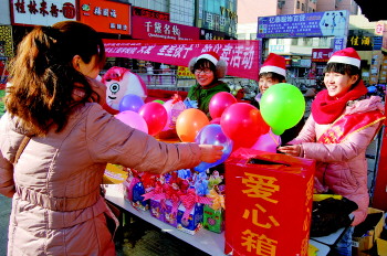 本报聊城12月21日讯(记者 王传胜) 20日、21日两天,聊城东昌智障孤独症康复训练学校与来自聊城大学的志愿者,组织圣诞节义卖平安果、气球活动,义卖所得将全部用来为星星的孩子购置学习用品。