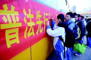 19日,黄岛区400多名中小学生在“关爱明天,普法先行”的横幅上签名,承诺诚信守法。当天,交运温馨校车黄岛公司开展了青少年普法教育签名活动,真正将校车打造成为“流动的普法课堂”。