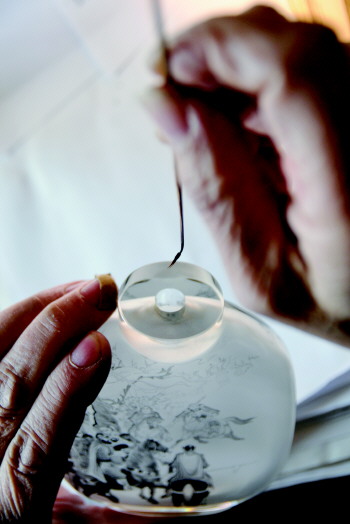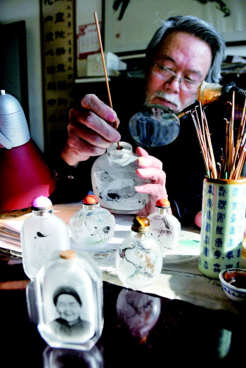 为了让作品更精美,在鼻烟壶内绘制内画时需借助放大镜。