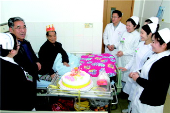 近日,淄矿中心医院医护人员为肿瘤血液科患者孙效堂庆祝了82岁生日。据了解,孙先生因胃部肿瘤已住院多时,为了给孙效堂一个惊喜,他的儿子就和该科护士长吕丽商议,希望在病房给父亲过一个特殊难忘的生日。医护人员及其家属一起为孙效堂唱起了生日祝福歌,并祝福老人早日康复。
