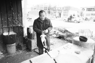 20日,市中区孟庄镇的一位鸡贩正在杀鸡,最近两天他的生意特别好。 本报记者 袁鹏 摄