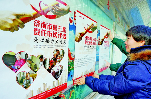 本报12月22日讯(记者 王倩 孟燕 蒋龙龙) 济南市第三届责任市民暨最佳公共服务奖评选正式启动,全城爱心大接力活动也已经展开。由第三届责任市民评选组委会印制的海报新鲜出炉,不少社区、单位以及个人希望能够张贴公益海报。22日,首份海报贴进了解放路街道文华园小区内宣传栏。